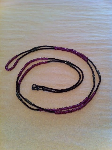 this is another one of those pieces whose sparkly goodness just doesn't translate in photos! debbie fisher uses pyrite and garnet in this delicate single strand of beads and gems.
